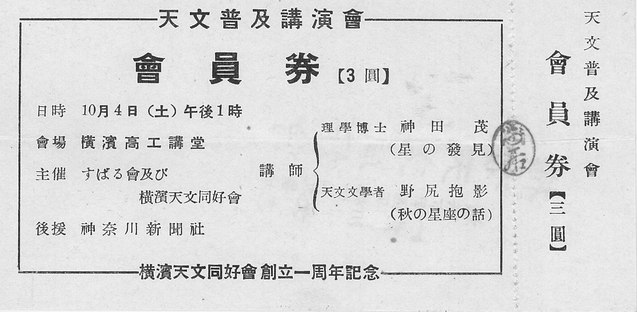 1947.10.04 すばる会の協力で本会創立一年記念講演会を開催。盛会。神田茂氏、山本一清氏、顧問に。